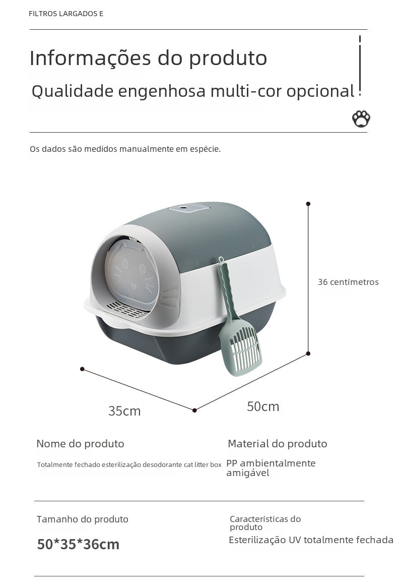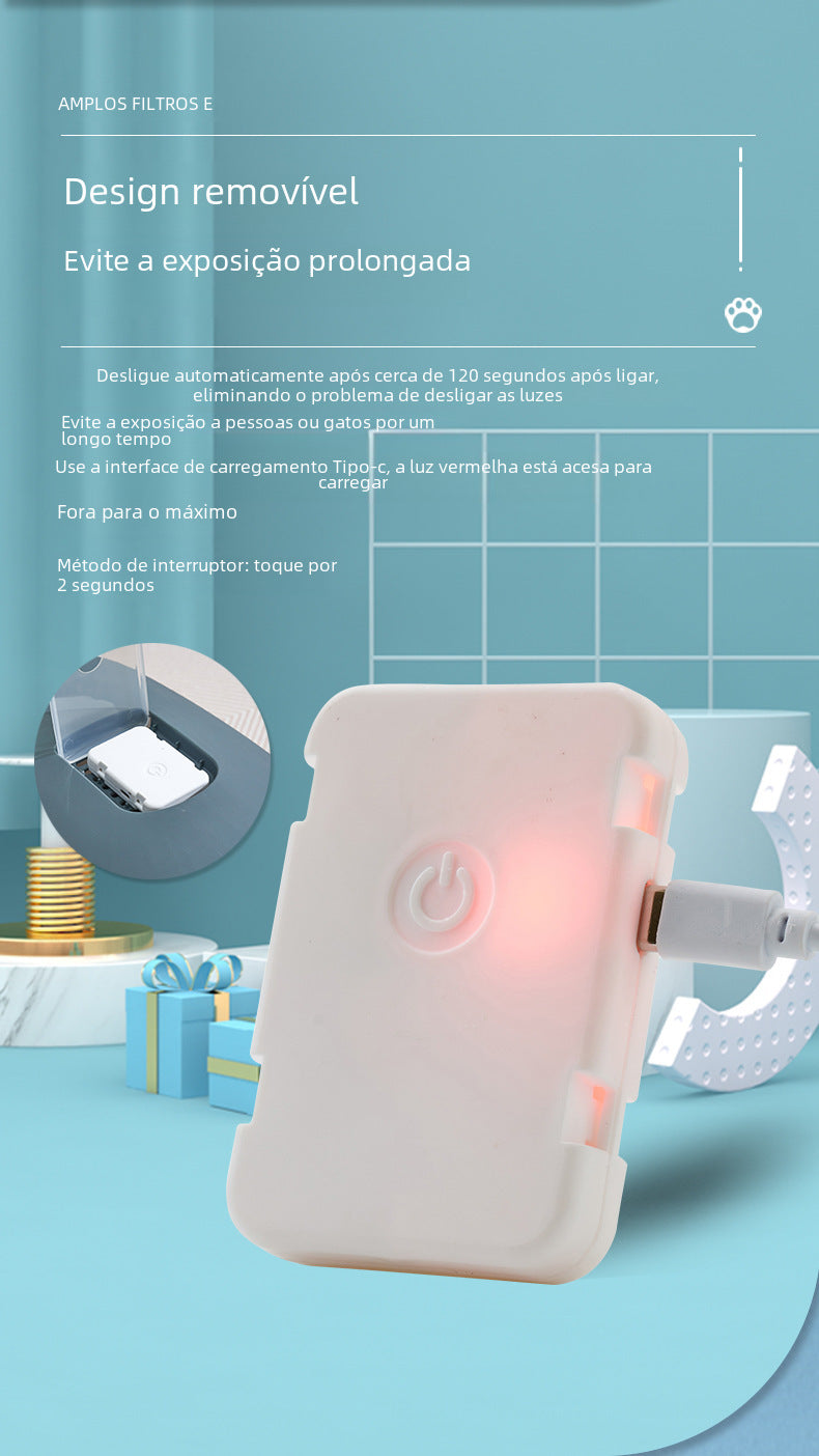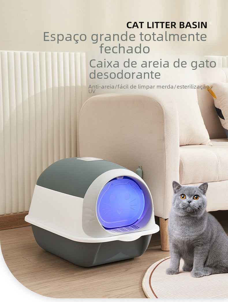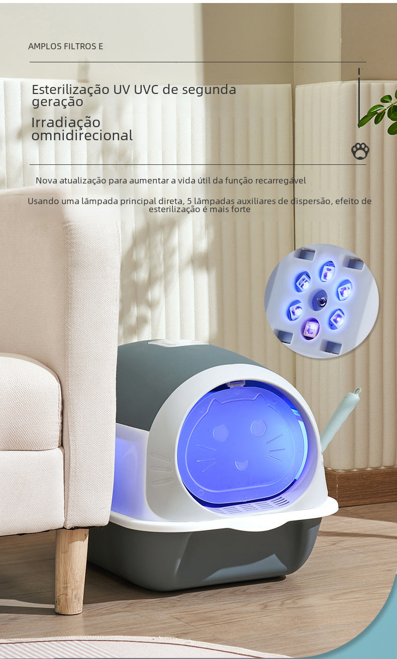 A Caixa de Areia para Gatos com Luz UV foi desenvolvida para garantir mais higiene, praticidade e segurança no dia a dia. Equipada com luz ultravioleta, ajuda a identificar resíduos invisíveis a olho nu, facilitando a limpeza completa e contribuindo para um ambiente mais saudável para o gato e o tutor.